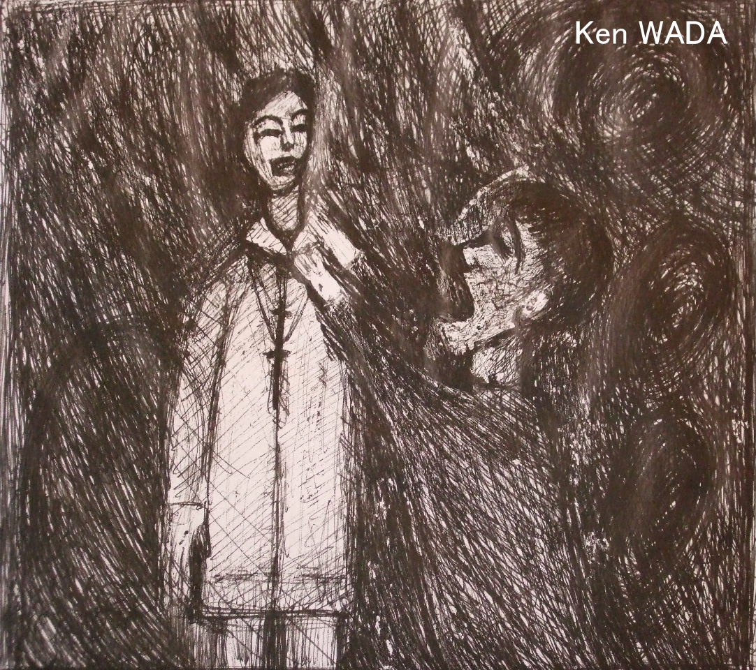(物語の最後でムルソーが司祭の法衣の襟くびをつかみ絶叫する場面)