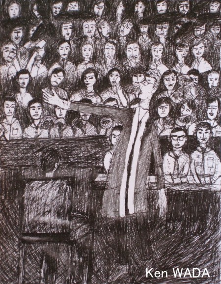 (猛烈な暑さの法廷で検事がムルソーに向かって勝ち誇ったように叫ぶ場面)